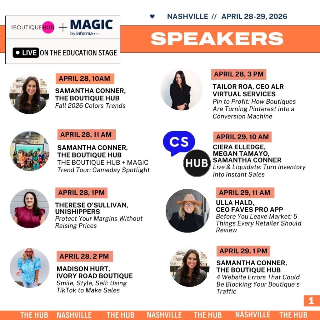 - 11 AM Education Stage: Samantha Conner from The Boutique Hub presents “4 Website Errors That Could Be Blocking Your Boutique’s Traffic”